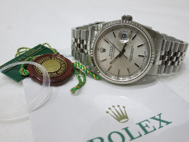 2016.08.24 着け心地抜群の定番モデル デイトジャスト, メンズモデル 本日はデイトジャスト旧型16234のシルバー文字盤をご紹介致します。18Kのフルーテッドベゼルが程よい高級感を演出しつつ、全体的に落ち着いた雰囲気が感じられます。シングルロックのブレスレットも非常に着け易く、多くのロレックスファンから支持を受けています。本商品は、2003年製で、バックルに少し線キズが見受けられますが、全体的にコンディション良くおすすめの一本となります。ご興味のあるお客様は広島店までお問合せ下さいませ。 セール価格 ¥489,900 セール価格 ¥468,000 082-249-9091 hiroshima@909.co.jp 16234 2003年製 SS+18KWG シルバー 36mm 100m 箱・保証書 157787 中古品を探す アンティークを探す 新品を探す >>>> >>>>